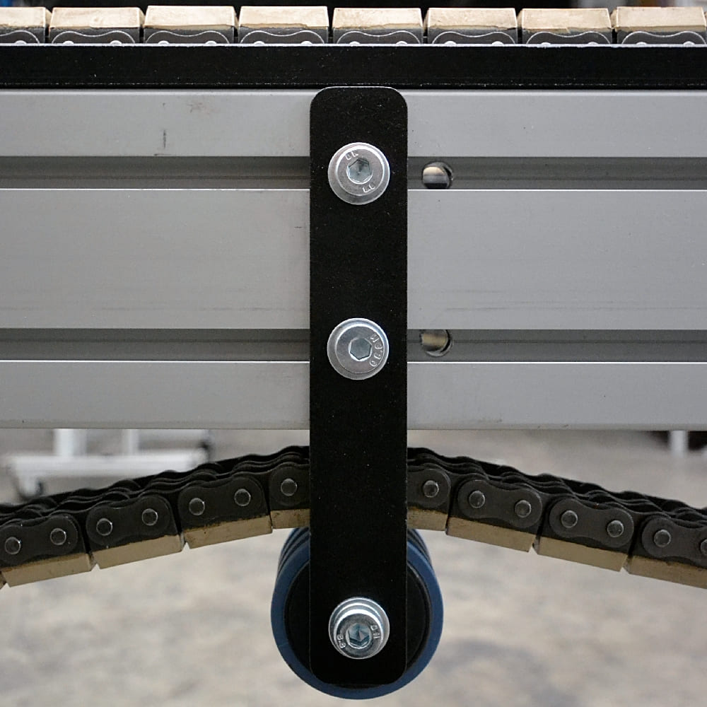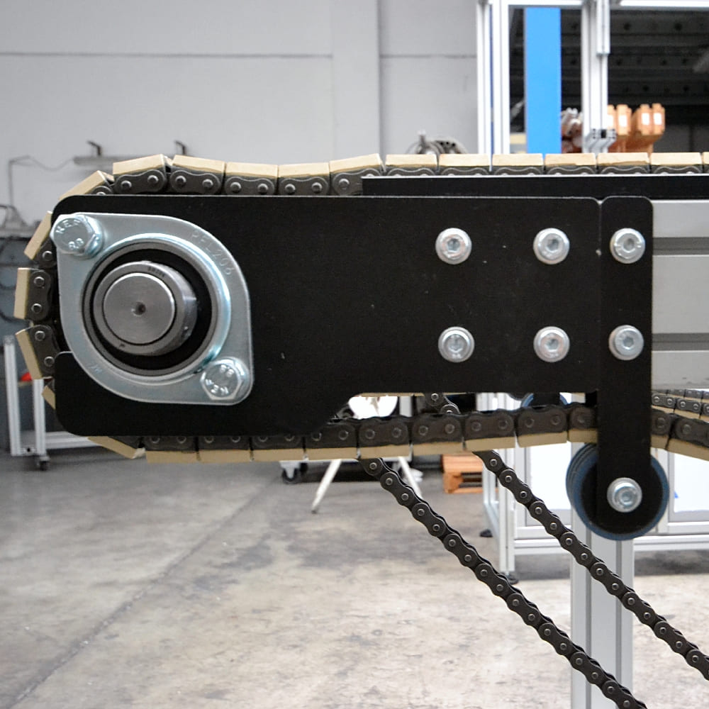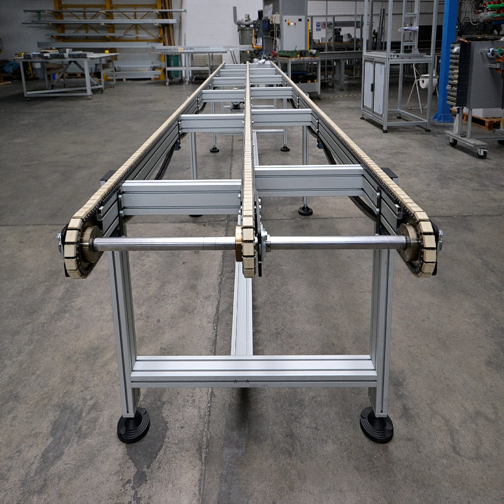 TRIMAT has included in its catalogs the product groups conveyors and parallel chain conveyor only after having carried out a careful market analysis linked to compatibility of the same with the proposed modular system in extruded profiles, renouncing by choice to forcibly expand its range with articles easily available in any hardware or tool shop.