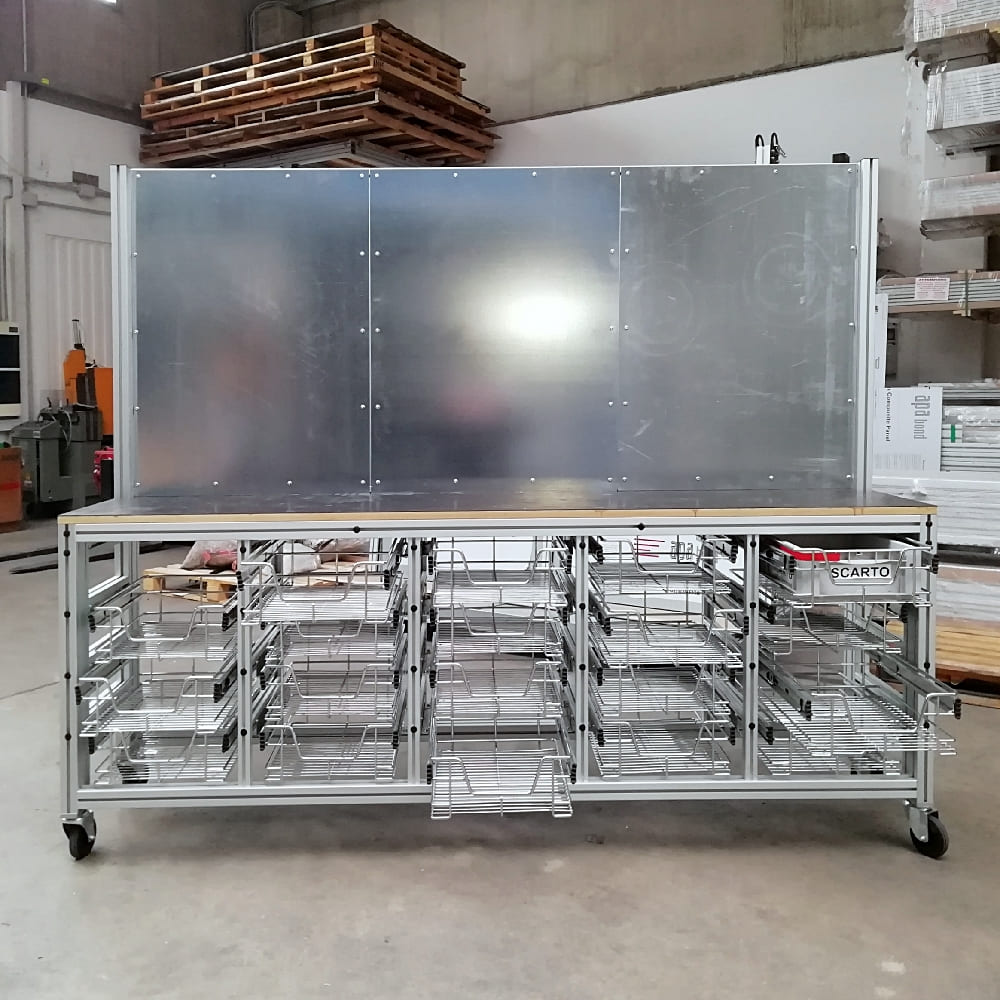 TRIMAT a inclus dans ses catalogues les groupes de produits cadres et bancs et banc à 20 tiroirs uniquement après avoir effectué une analyse de marché approfondie liée à la compatibilité de même avec le système modulaire proposé en profilés extrudés, renonçant par choix à élargir de force sa gamme avec des articles facilement disponibles dans n'importe quel magasin de quincaillerie ou d'outillage.